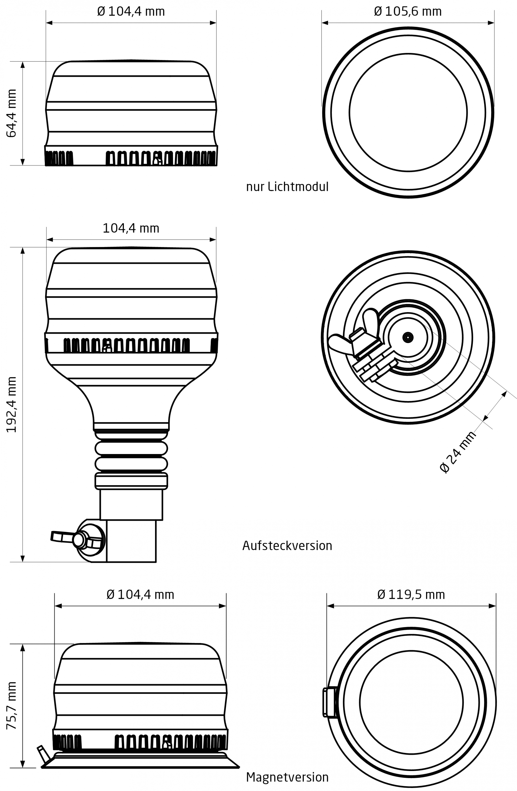 Sie ist als rotierende oder blitzende Kennleuchte, Festmontage nach ISO, mit Magnet- oder Aufsteckversion erhältlich.