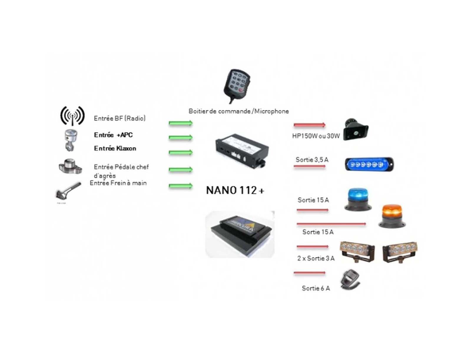 Le système de commande NANO 112+ est conçu pour les véhicules prioritaires. Ce boîtier multifonction centralise toutes les commandes de signalisation, garantissant une utilisation simple et efficace. Grâce à ses protections avancées, il assure une sécurité optimale pour vos équipements.