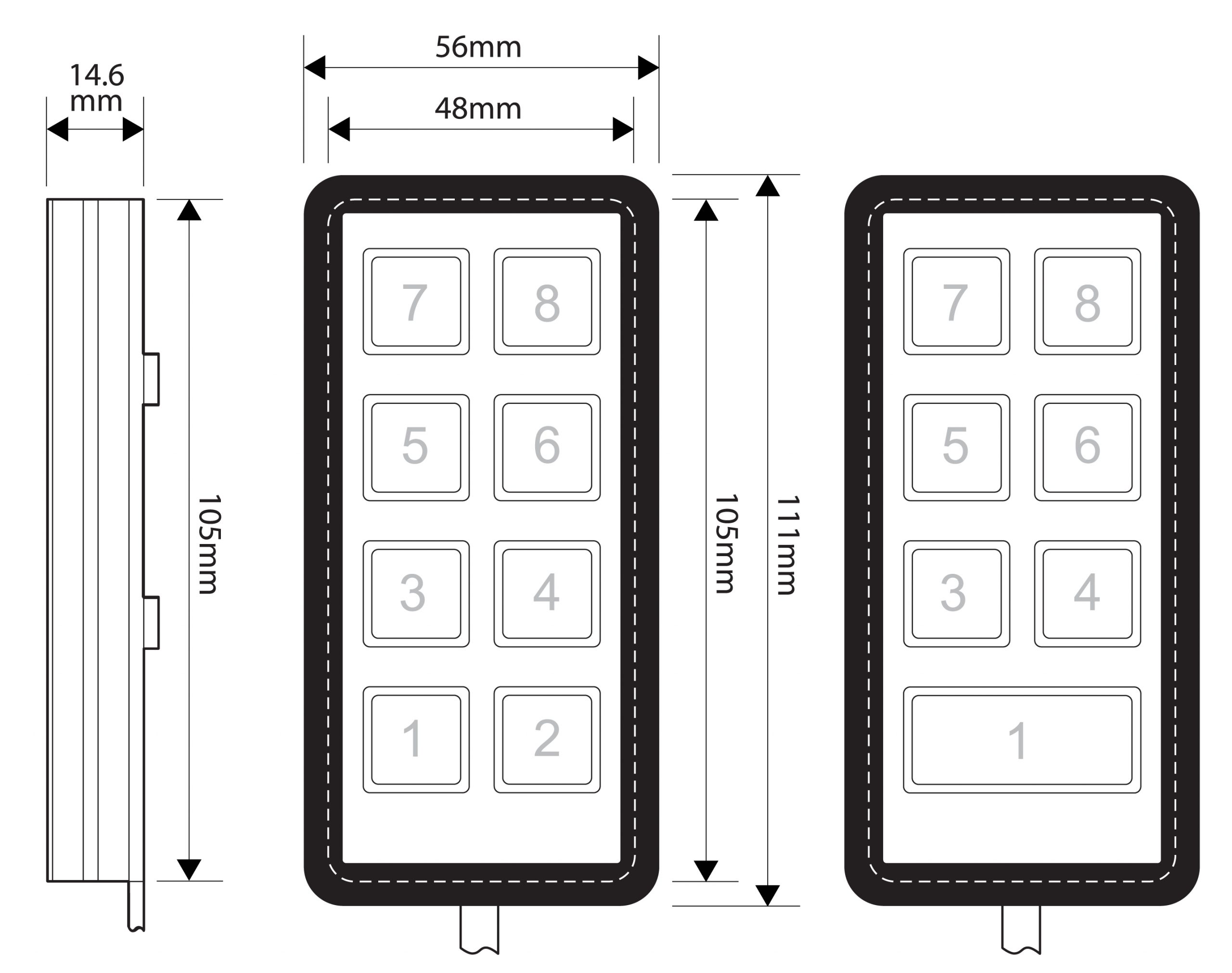 The MCS-T8 Mini Handset consists of 8 small buttons or 7 buttons (six small and one double) with the appropriate legend and key colour, however, by combining 2 small buttons to make 1 large one the unit can have as few as 4 buttons if required.