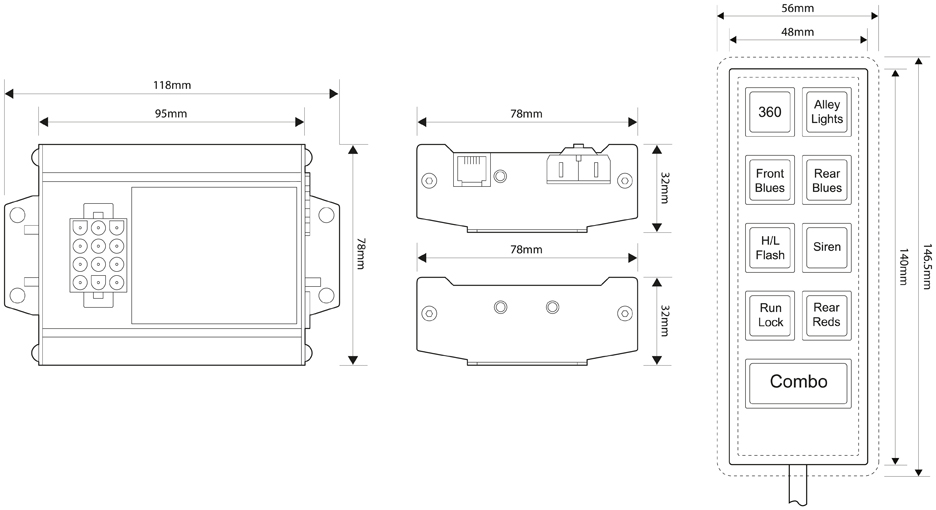 Combining two MCS-6E control units and the 9 button handset, the Midi Control System has all the features and functions of the MCS-MINI System, but due to the increased number of switches and associated outputs is ideally suited to applications needing more of both these operational facilities. Also, because there are actually more control lines (outputs) than switches this combination of devices is suited to applications where a single switch needs more than one output, for example flashing head lights, as one output is required per head lamp or alternatively alternating rear red lamps – note this feature is not available on the Mini or Maxi systems.