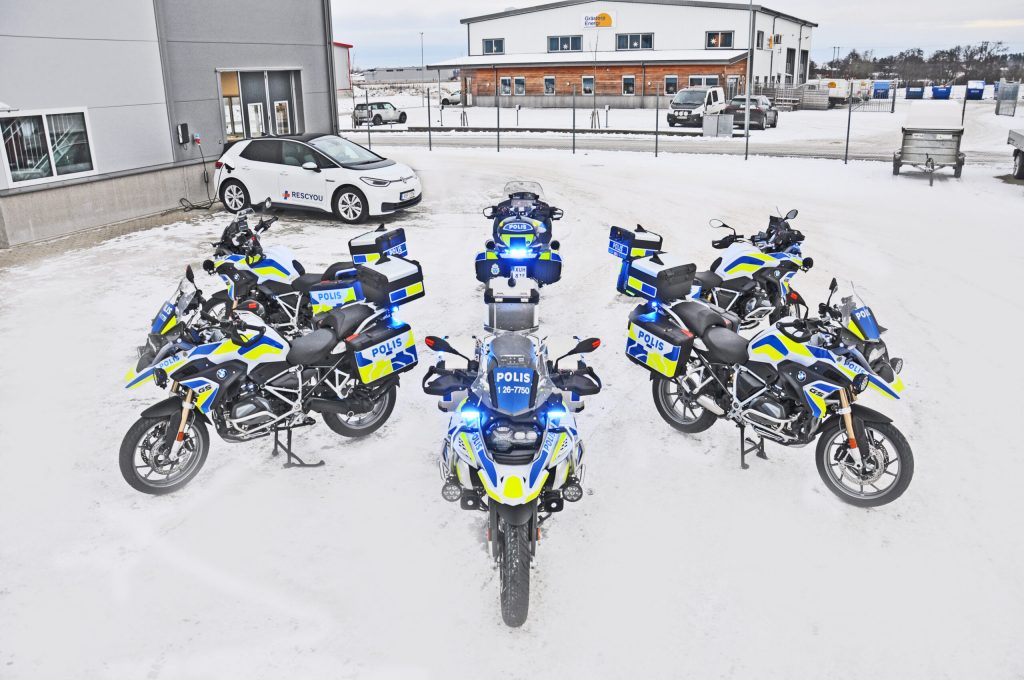 Polismotorcykel byggd på en BMW av Rescyou till Polisen Sverige. Standby-produkter på motorcykeln är L54 och L88 varningsljus samt MP5 Högtalare/förstärkare.