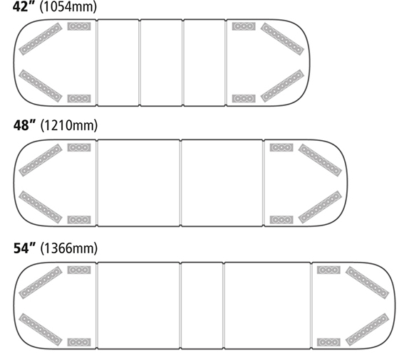 Available from 42” (1054mm) up to 54” (1370mm) long as standard with 7 selectable flash patterns and operates at 12v as standard with 24v available to order.